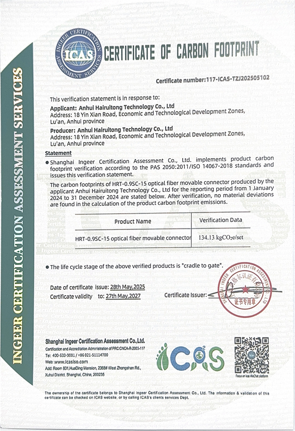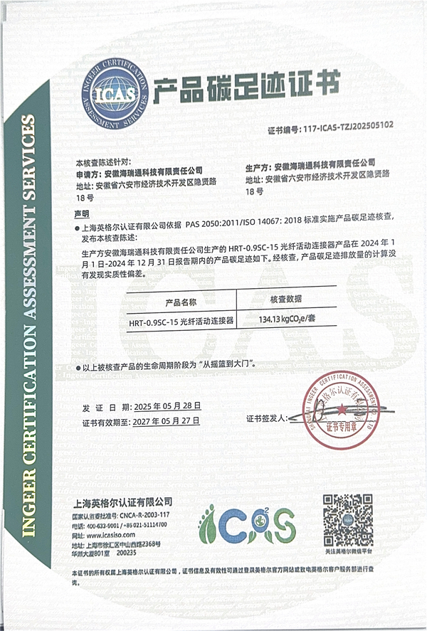 安徽海瑞通科技有限责任公司履行ESG责任,定期披露光纤活动连接器产品碳足迹(2024年度)证书及信息报告